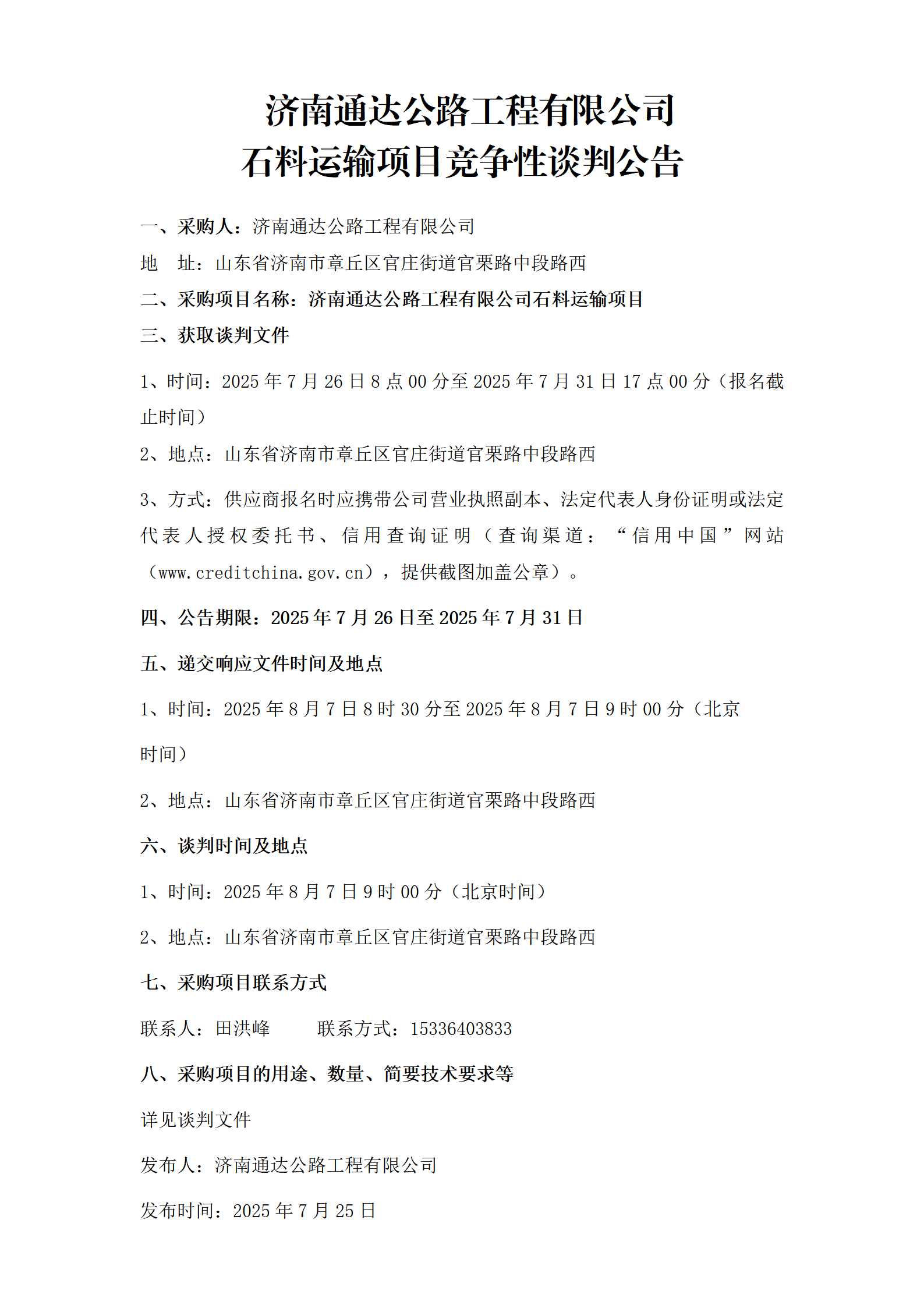 济南通达公路工程有限公司石料运输项目竞争性谈判公告