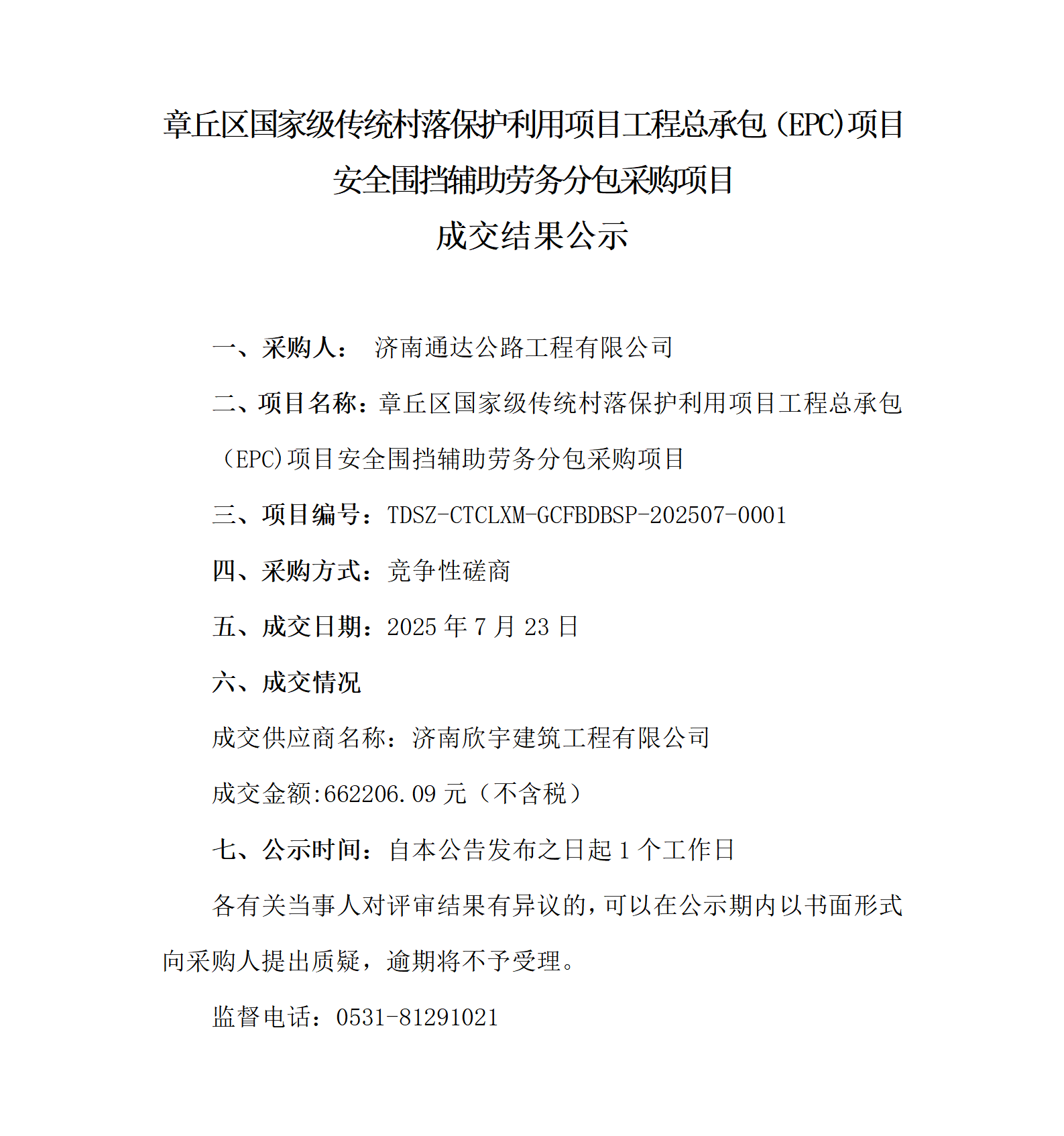 章丘区国家级传统村落保护利用项目工程总承包(EPC)项目安全围挡辅助劳务分包采购项目成交结果公示