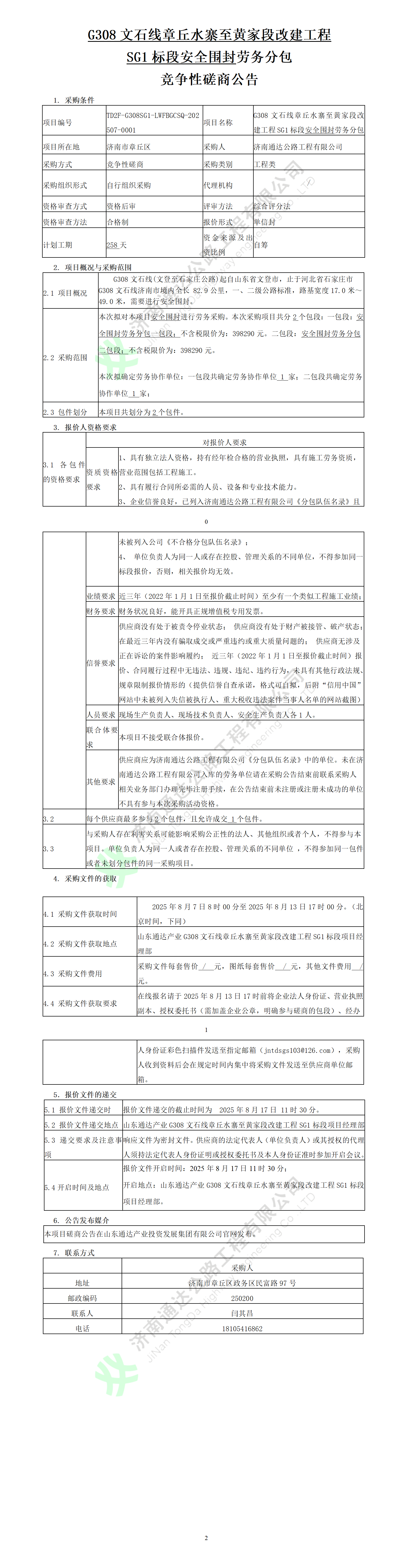 G308文石线章丘水寨至黄家段改建工程SG1标段安全围封劳务分包竞争性磋商公告