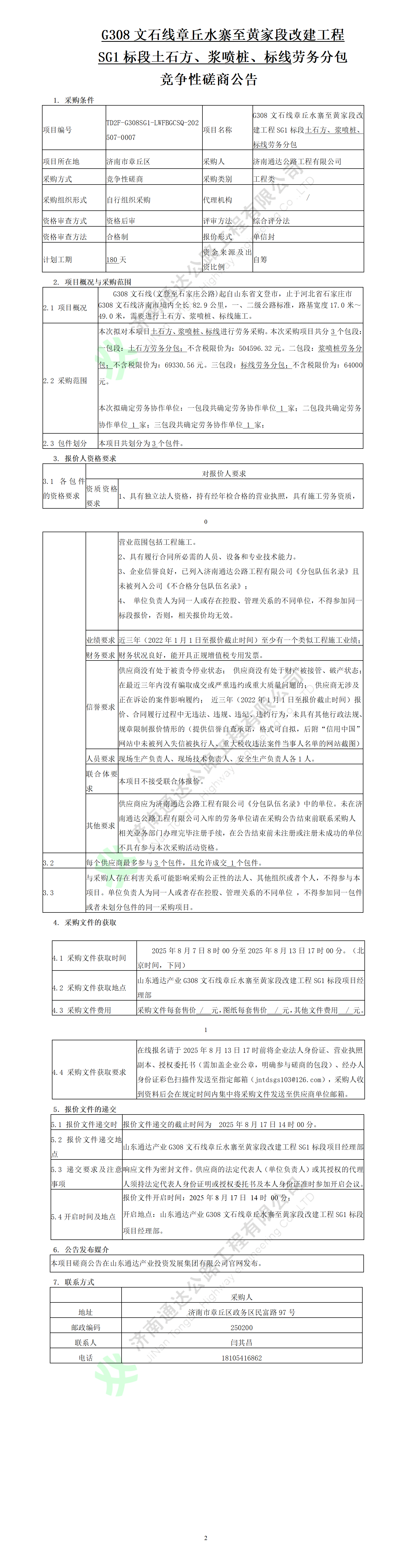 G308文石线章丘水寨至黄家段改建工程SG1标段土石方、浆喷桩、标线劳务分包竞争性磋商公告