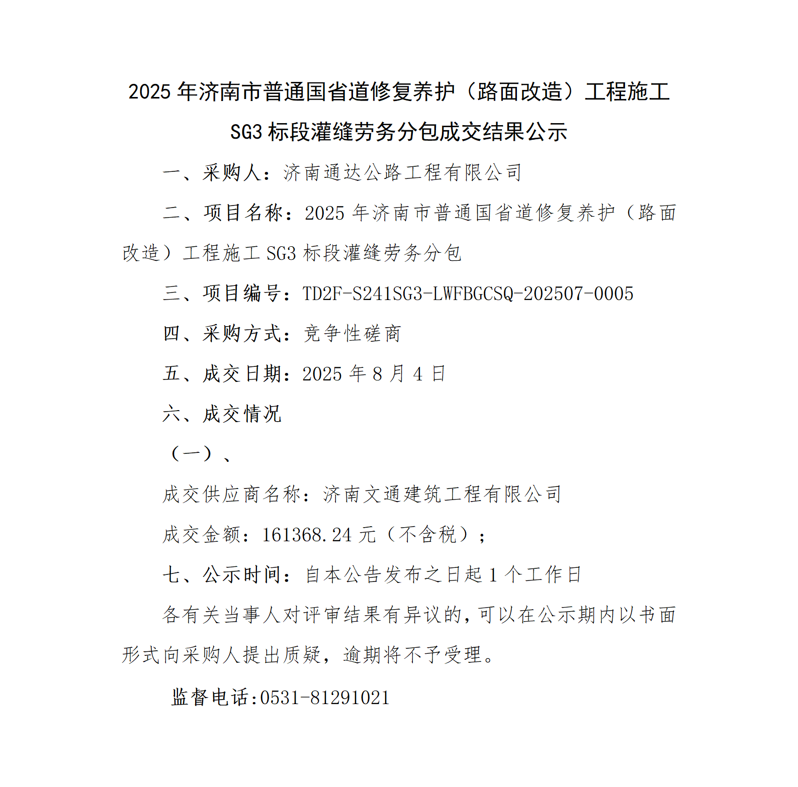 2025年济南市普通国省道修复养护(路面改造)工程施工SG3标段灌缝劳务分包成交结果公示