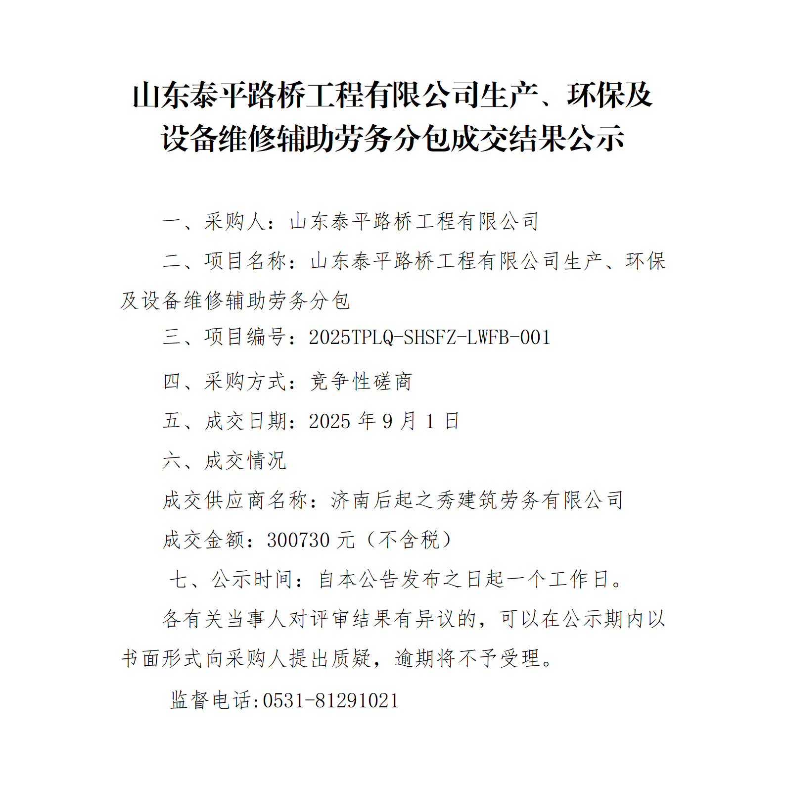山东泰平路桥工程有限公司生产、环保及设备维修辅助劳务分包成交结果公示