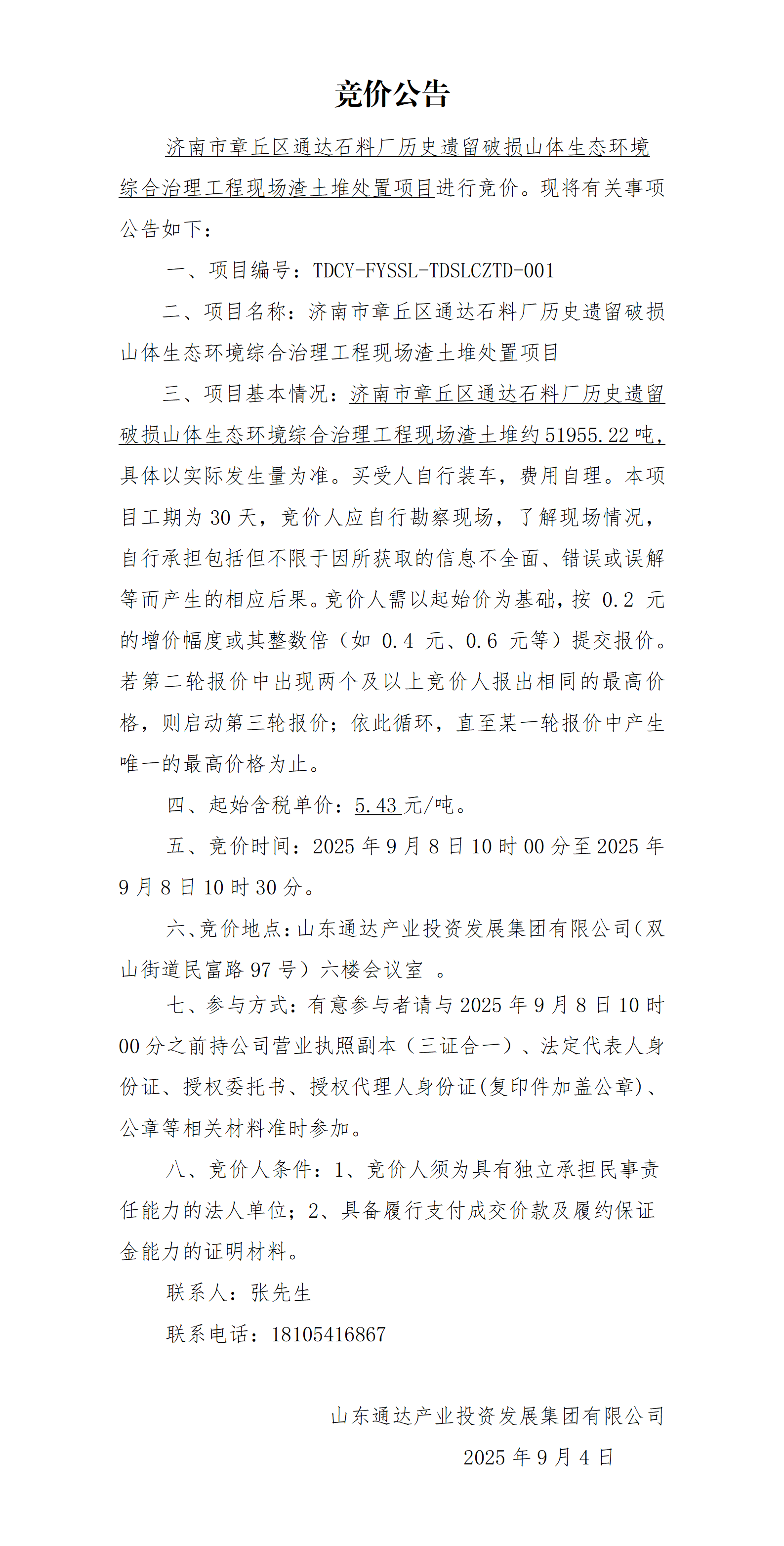 济南市章丘区通达石料厂历史遗留破损山体生态环境综合治理工程现场渣土堆处置项目竞价公告