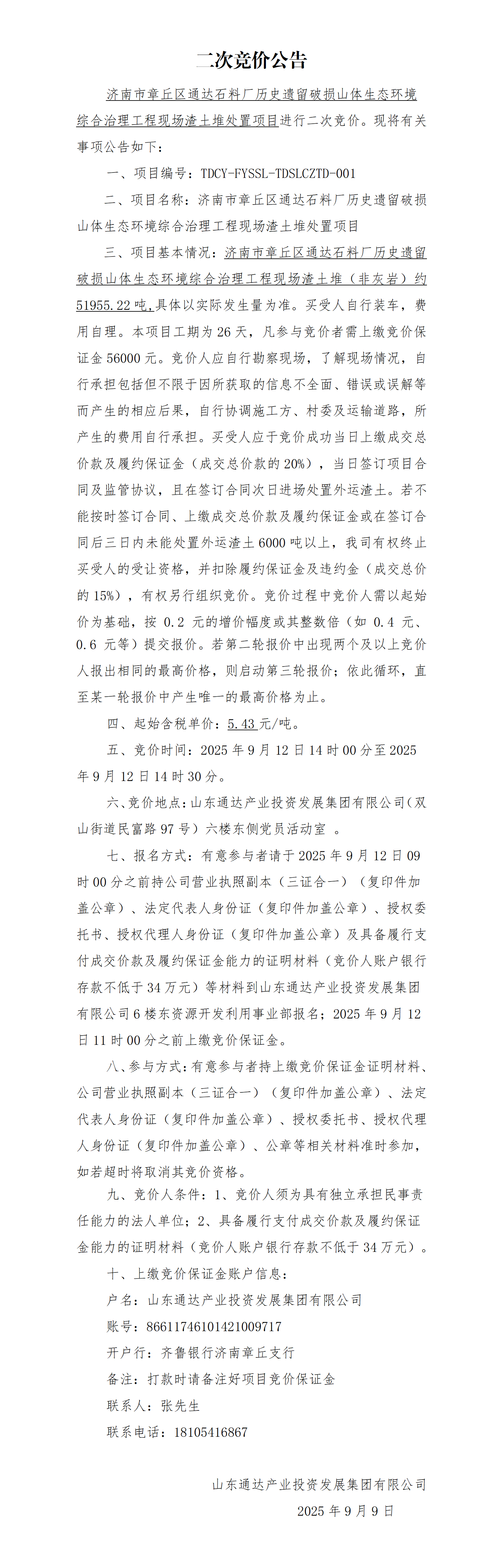 济南市章丘区通达石料厂历史遗留破损山体生态环境综合治理工程现场渣土堆处置项目二次竞价公告