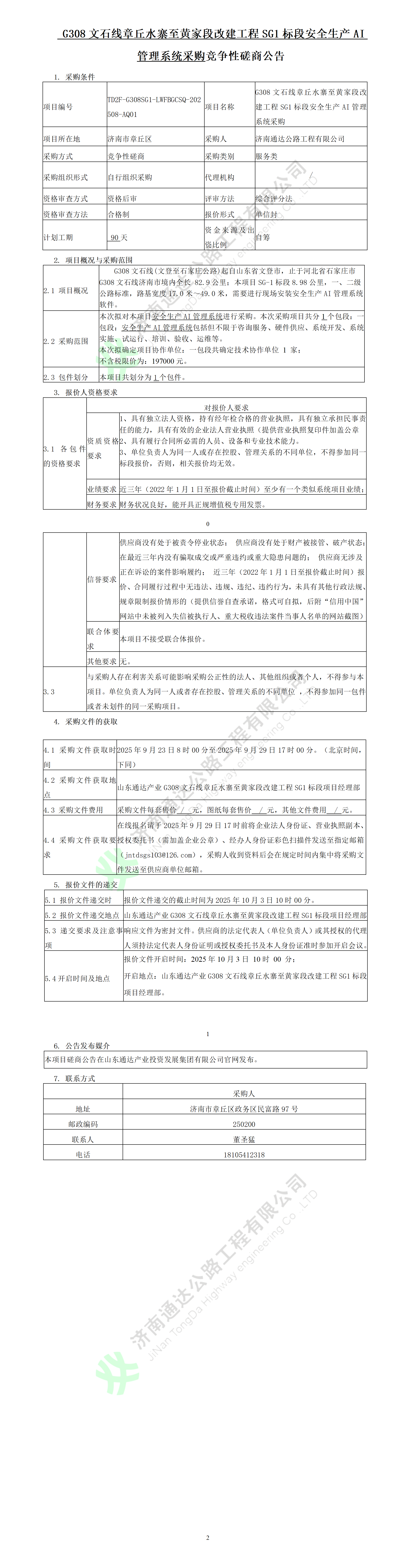 G308文石线章丘水寨至黄家段改建工程SG1标段安全生产AI管理系统采购竞争性磋商公告
