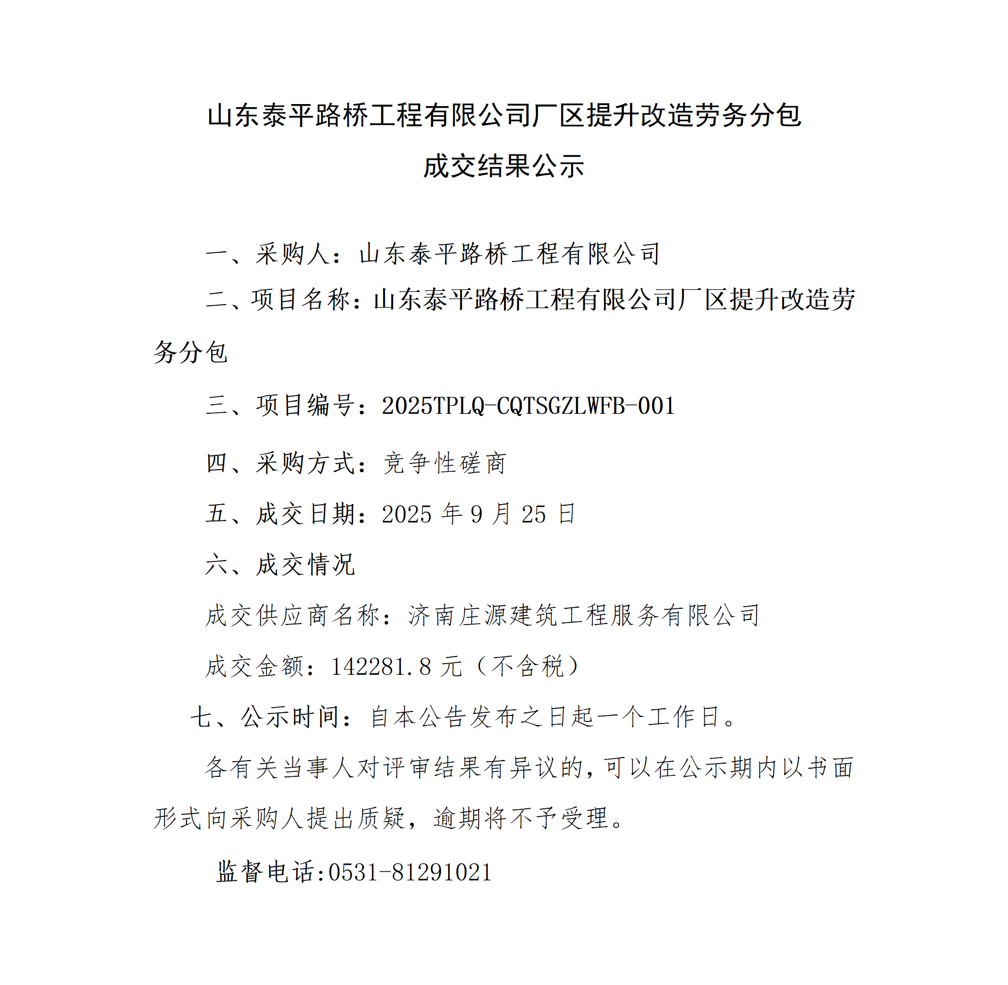 山东泰平路桥工程有限公司厂区提升改造劳务分包成交结果公示