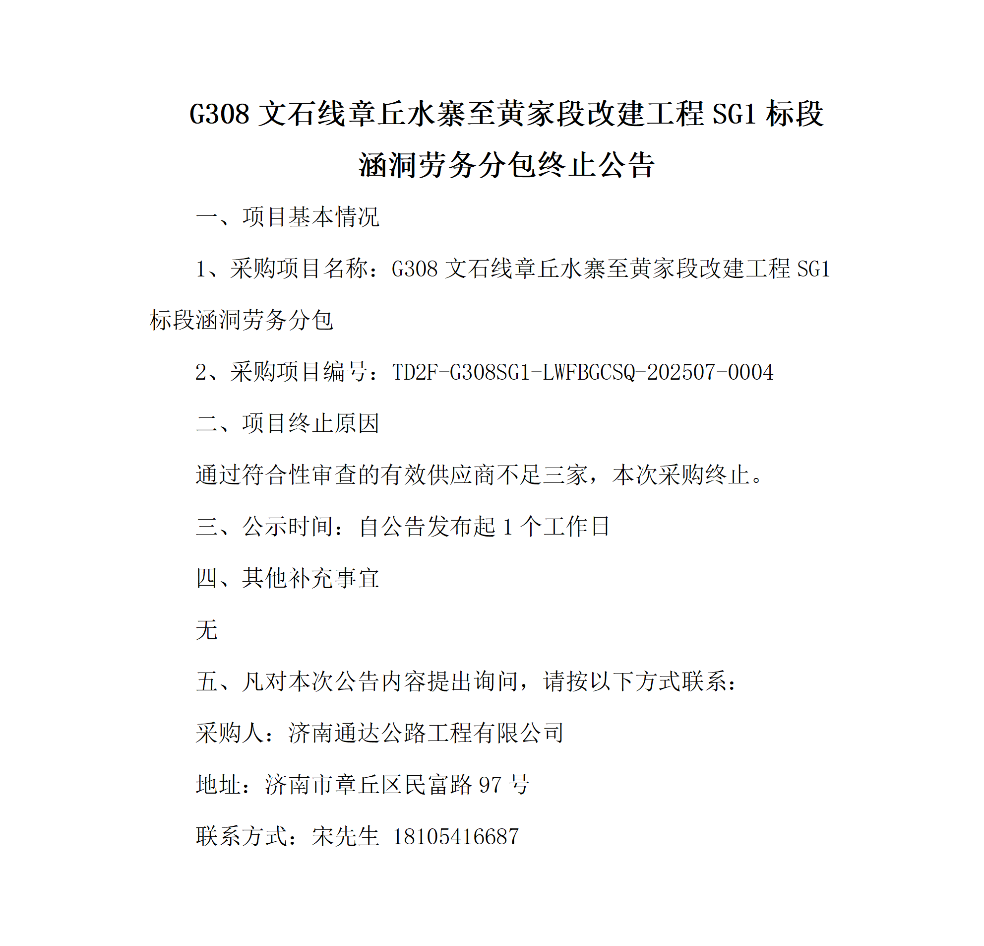G308文石线章丘水寨至黄家段改建工程SG1标段涵洞劳务分包终止公告