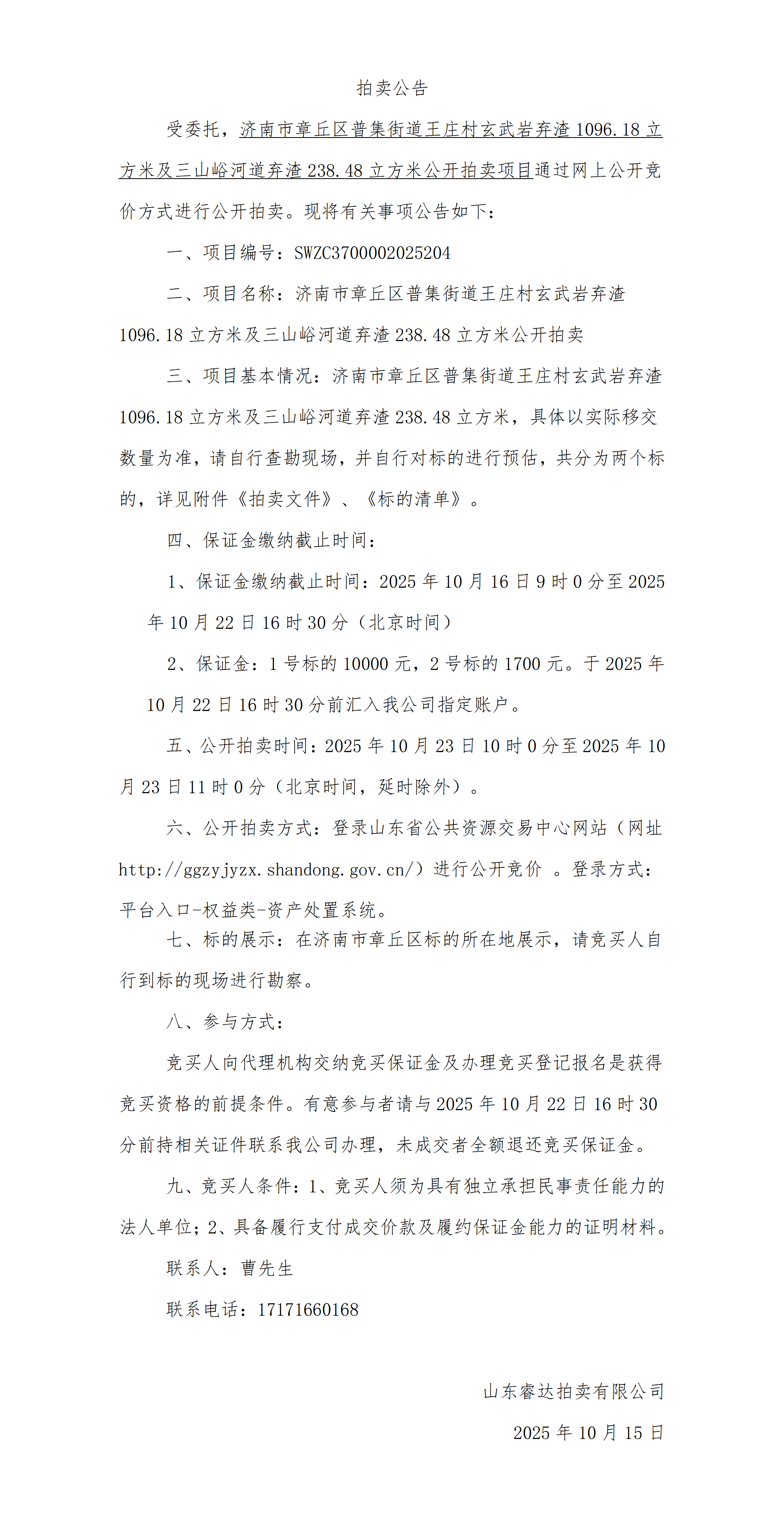 济南市章丘区普集街道王庄村玄武岩弃渣1096.18立方米及三山峪河道弃渣238.48立方米公开拍卖项目拍卖公告