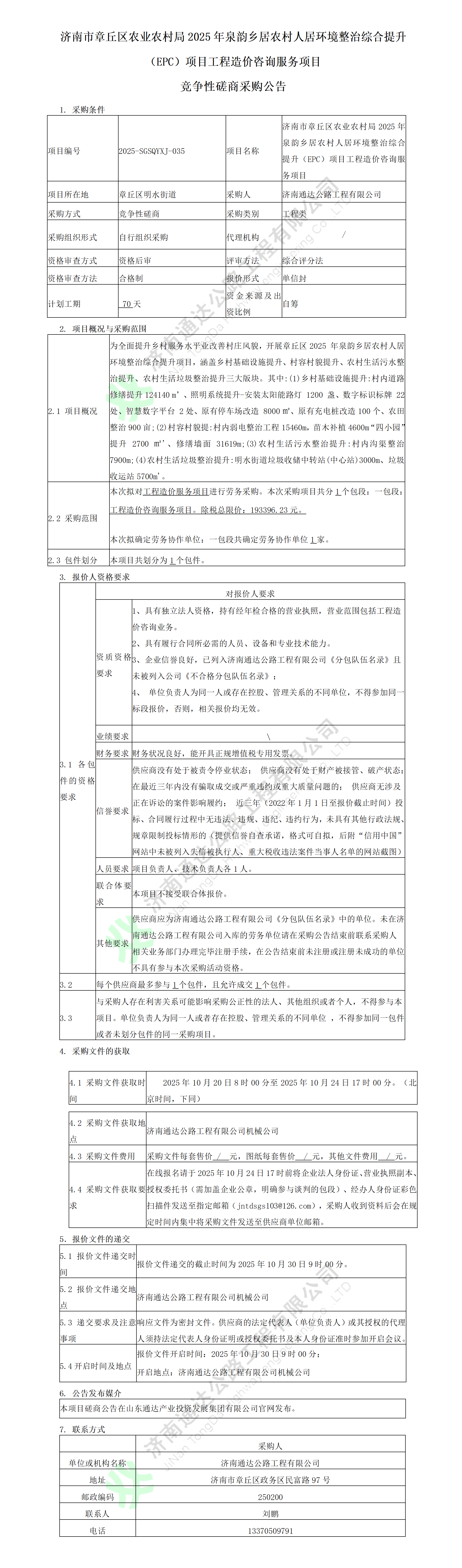 济南市章丘区农业农村局2025年泉韵乡居农村人居环境整治综合提升(EPC)项目工程造价咨询服务竞争性磋商采购公告