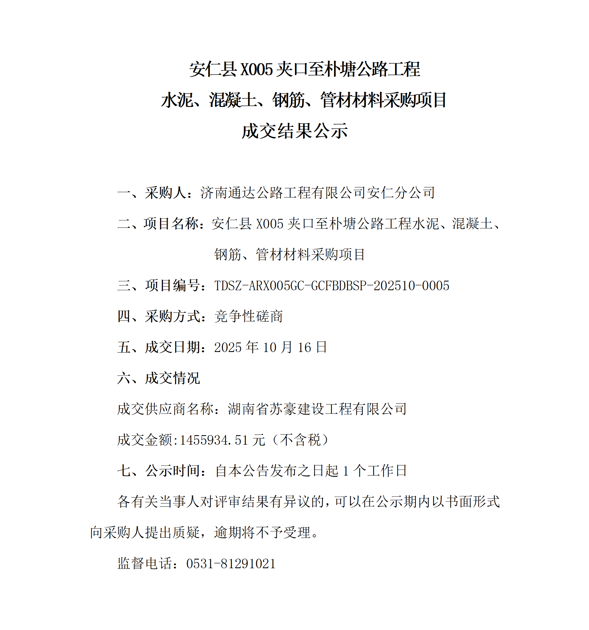 安仁县X005夹口至朴塘公路工程水泥、混凝土、钢筋、管材材料采购项目成交结果公示