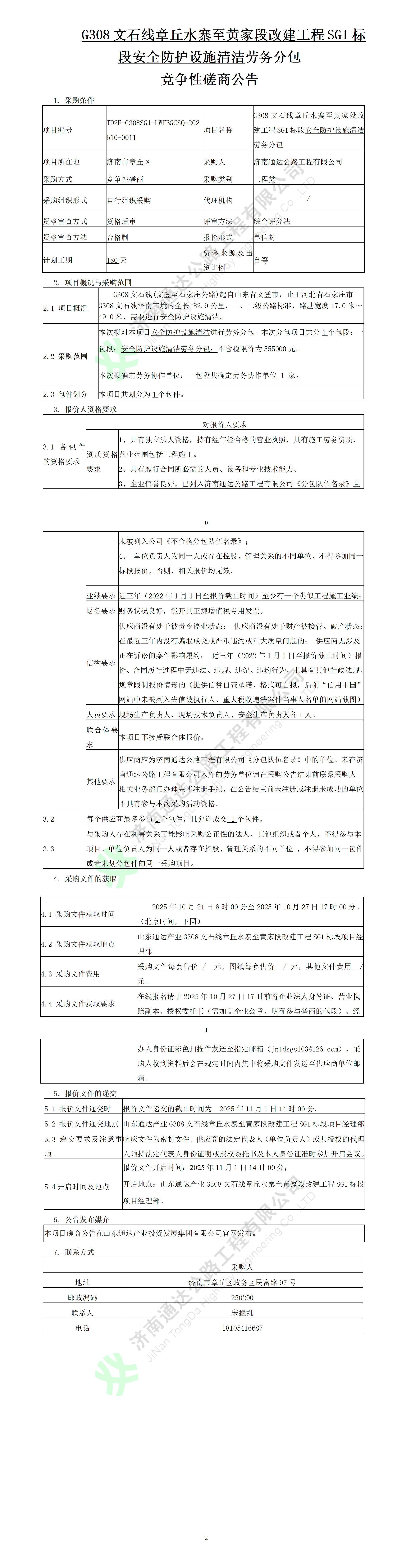 G308文石线章丘水寨至黄家段改建工程SG1标段安全防护设施清洁劳务分包竞争性磋商公告