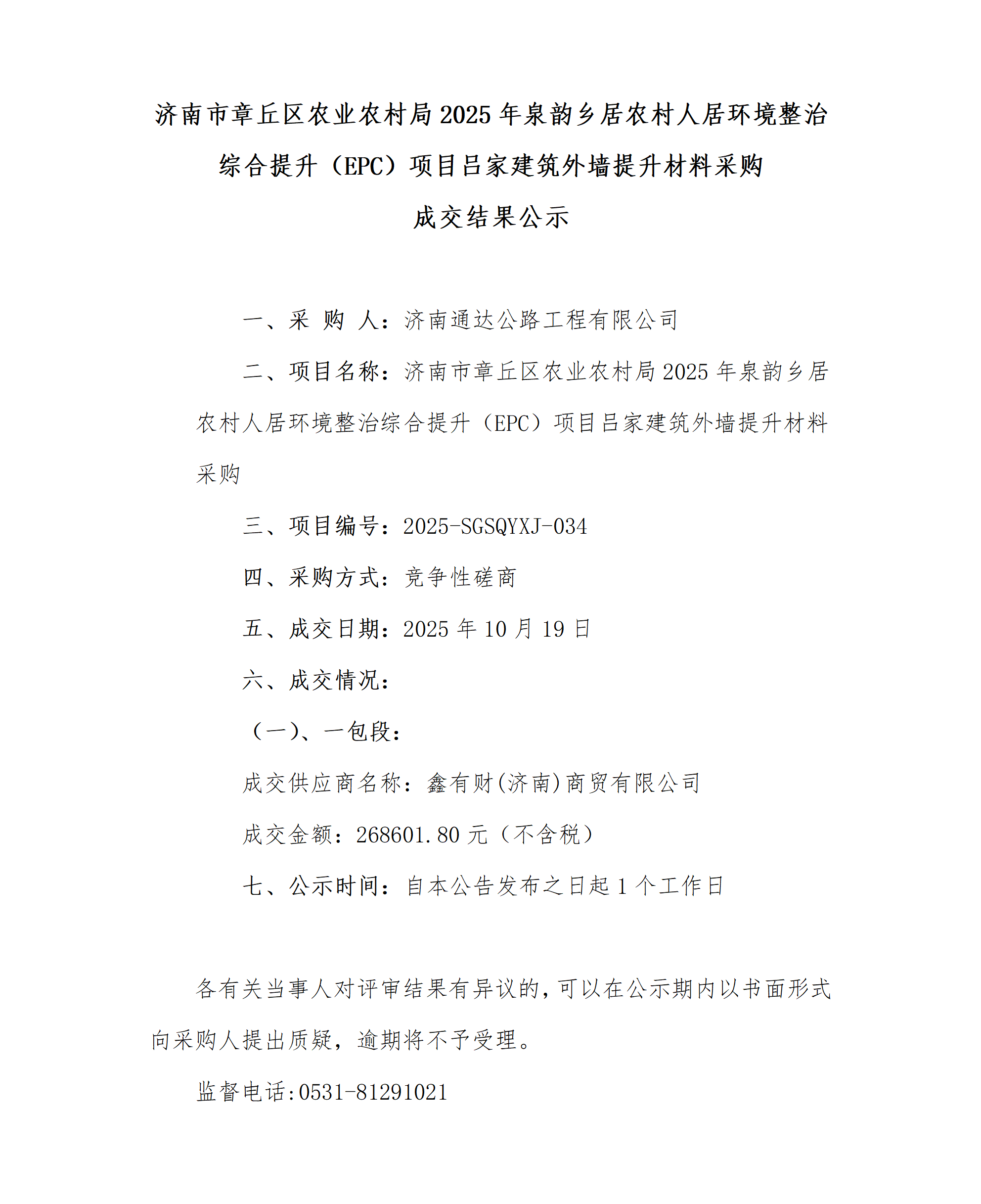 济南市章丘区农业农村局2025年泉韵乡居农村人居环境整治综合提升(EPC)项目吕家建筑外墙提升材料采购成交结果公示