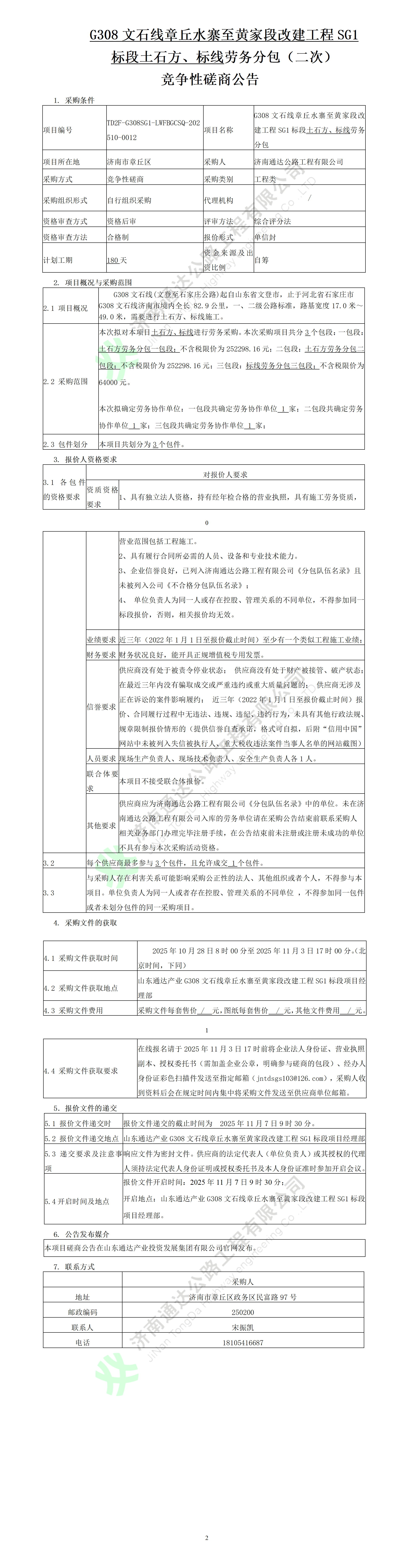 G308文石线章丘水寨至黄家段改建工程SG1标段土石方、标线劳务分包竞争性磋商公告