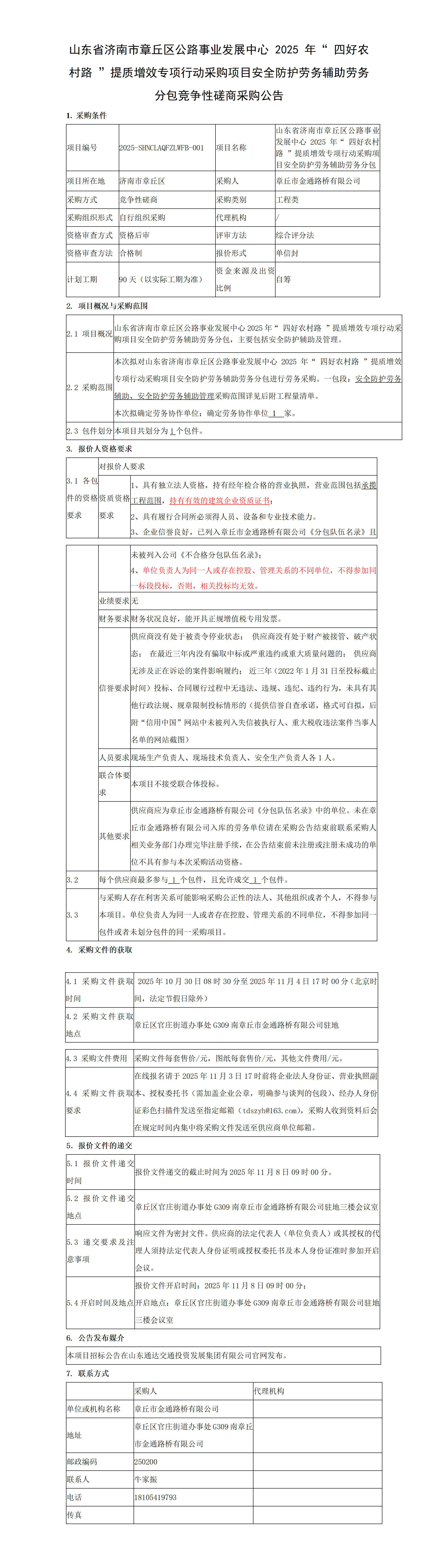 山东省济南市章丘区公路事业发展中心 2025 年“ 四好农村路 ”提质增效专项行动采购项目安全防护劳务辅助劳务分包竞争性磋商采购公告
