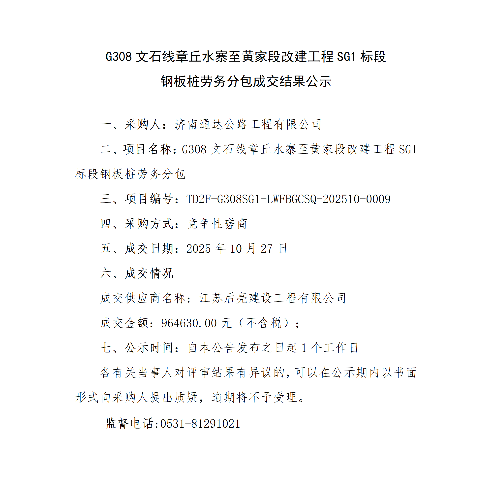 G308文石线章丘水寨至黄家段改建工程SG1标段钢板桩劳务分包成交结果公示