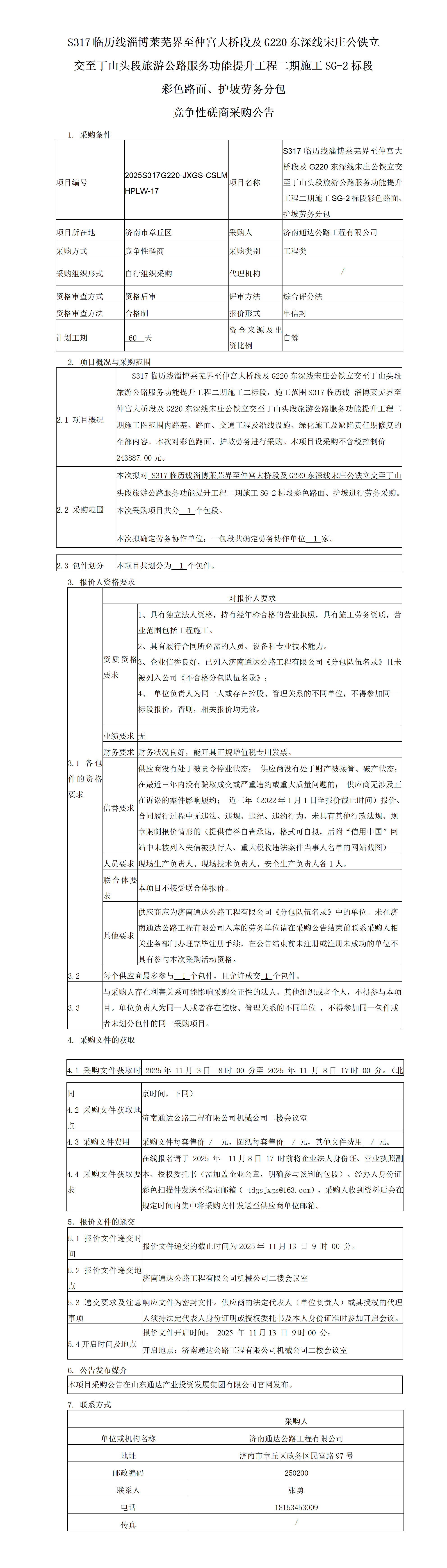 S317临历线淄博莱芜界至仲宫大桥段及G220东深线宋庄公铁立交至丁山头段旅游公路服务功能提升工程二期施工SG-2标段彩色路面、护坡劳务分包竞争性磋商公告