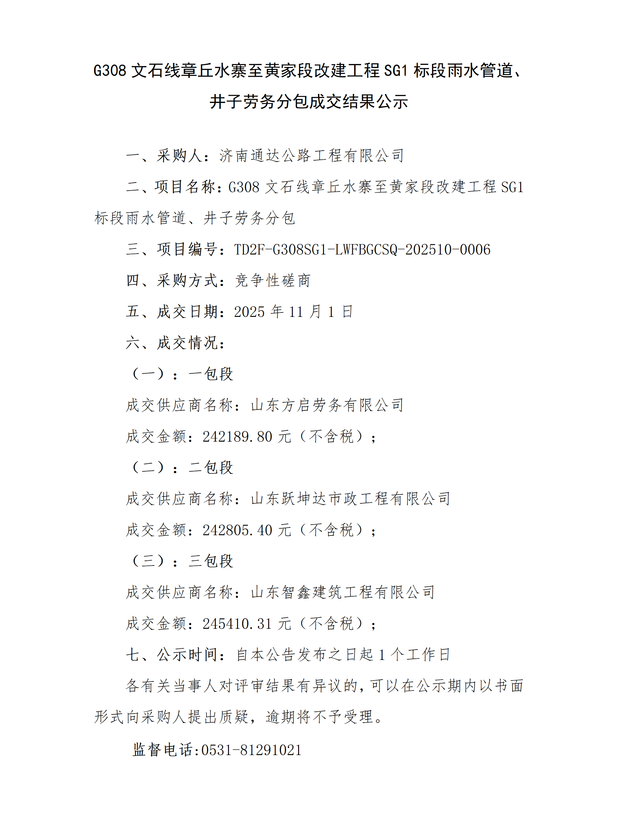 G308文石线章丘水寨至黄家段改建工程SG1标段雨水管道、井子劳务分包成交结果公示