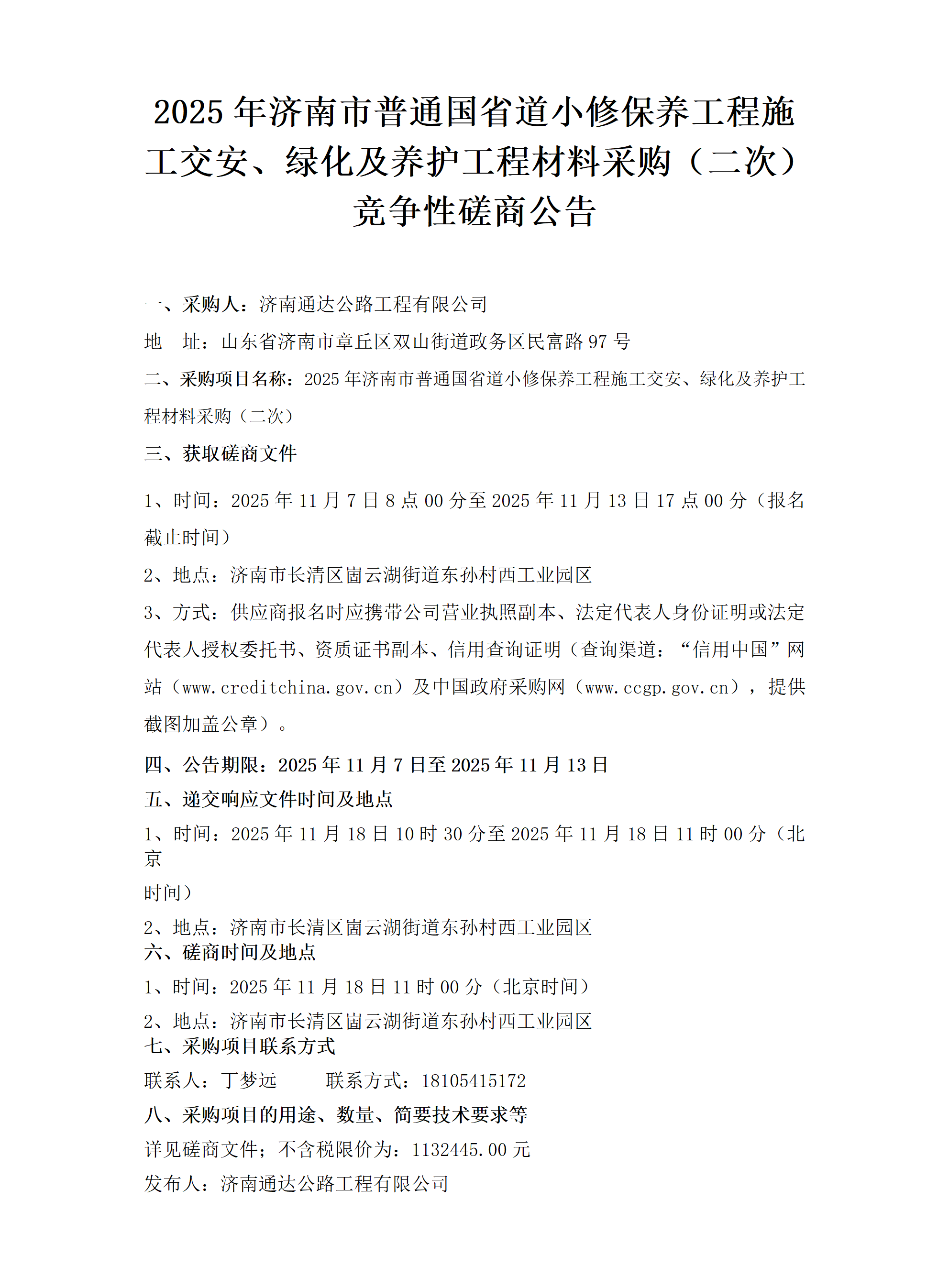 2025年济南市普通国省道小修保养工程施工交安、绿化及养护工程材料采购(二次) 竞争性磋商公告