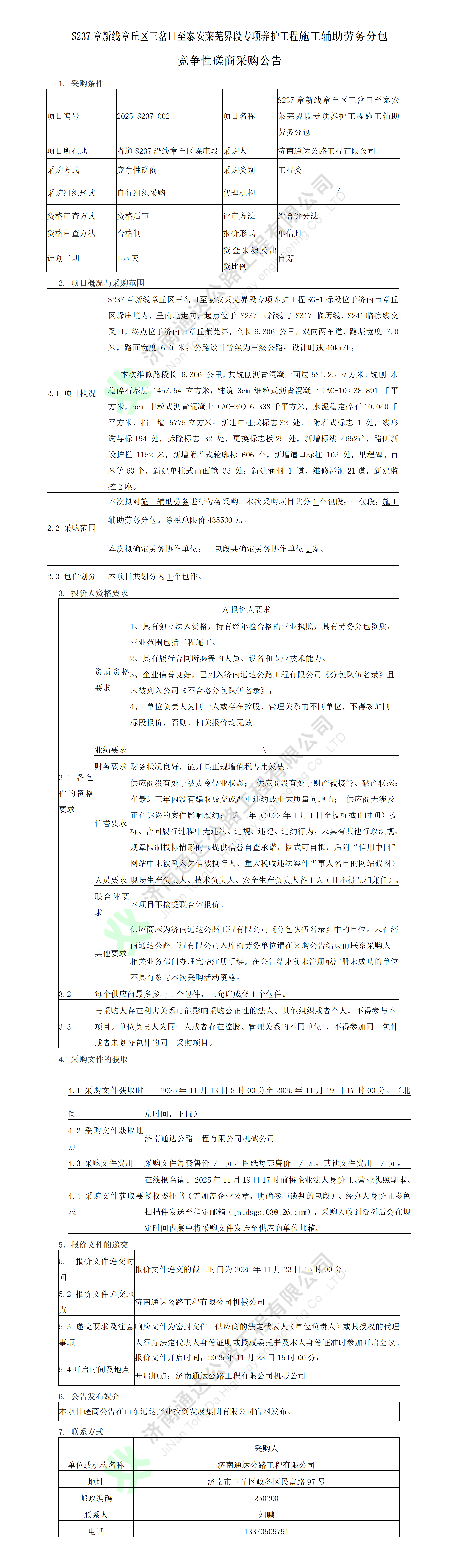 S237章新线章丘区三岔口至泰安莱芜界段专项养护工程施工辅助劳务分包竞争性磋商采购公告