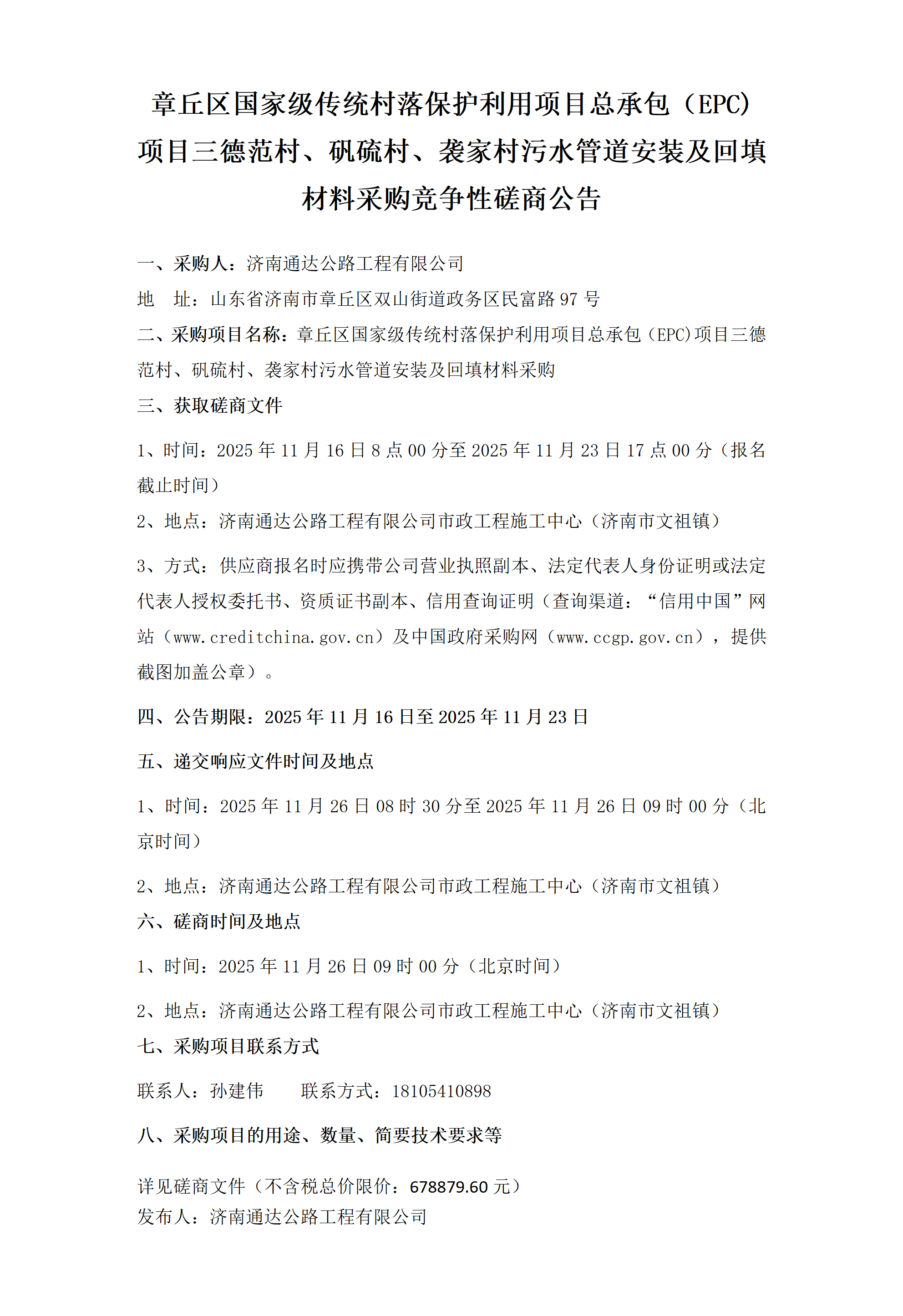 章丘区国家级传统村落保护利用项目工程总承包(EPC)三德范村、矾硫村、袭家村污水管道安装及回填材料采购竞争性磋商公告