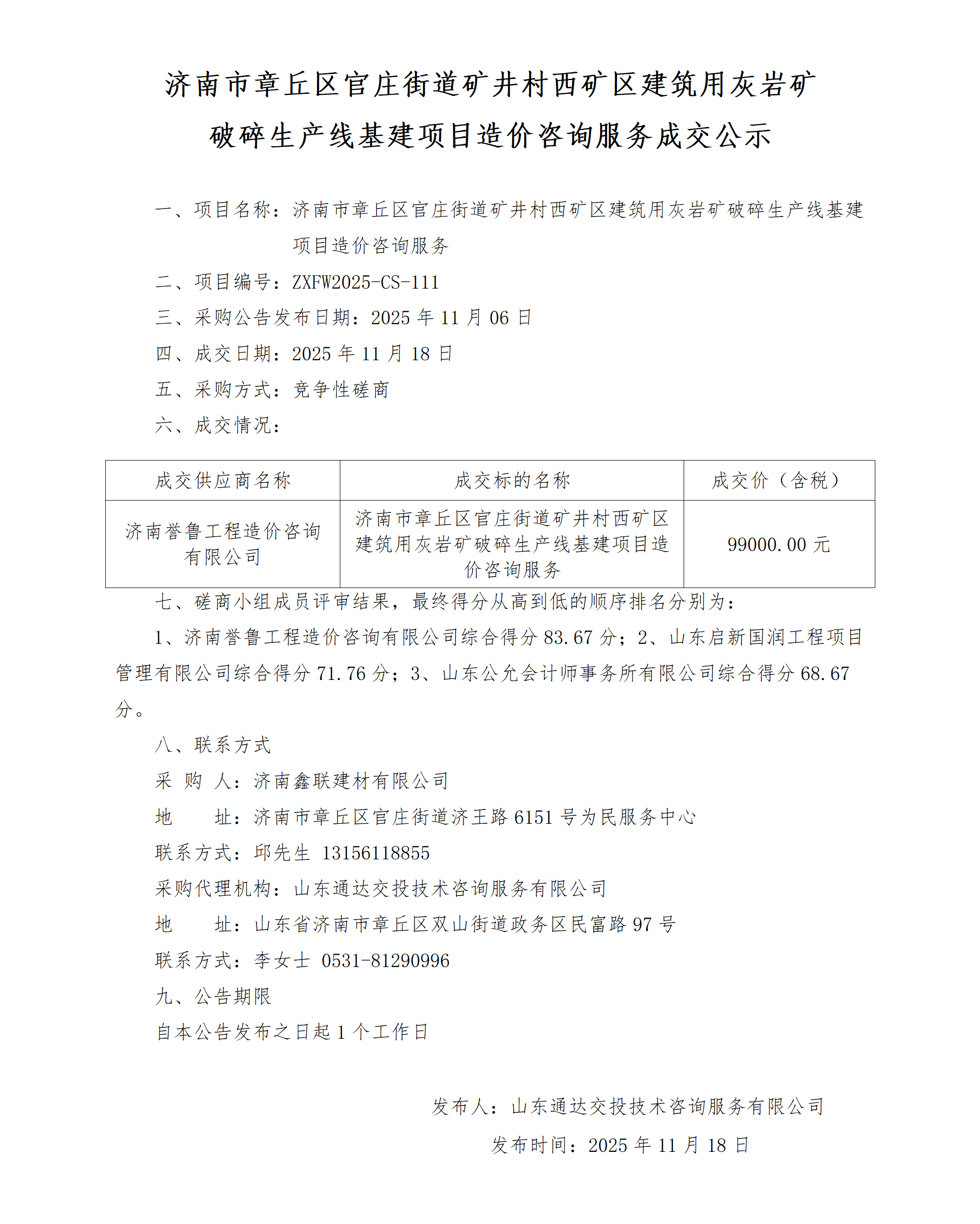 济南市章丘区官庄街道矿井村西矿区建筑用灰岩矿破碎生产线基建项目清单及招标控制价编制服务成交公示
