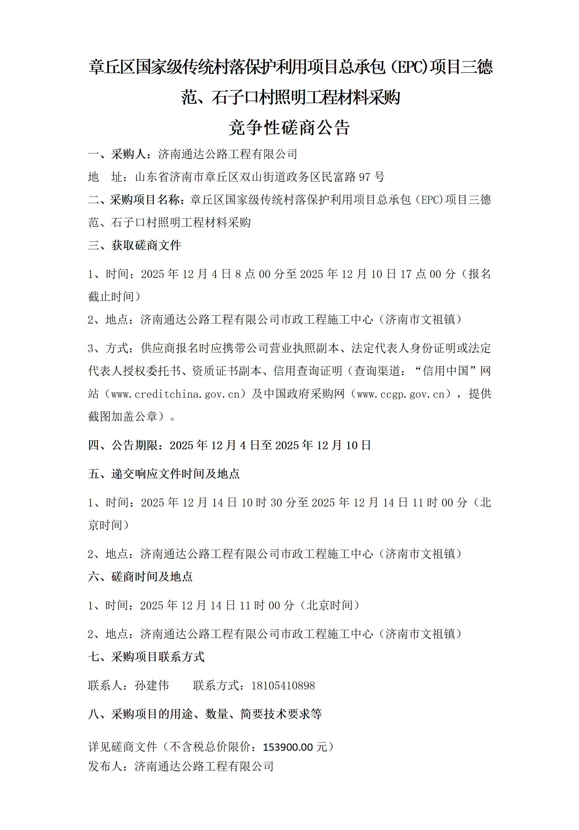 章丘区国家级传统村落保护利用项目总承包(EPC)项目三德范、石子口村照明工程材料采购竞争性磋商公告