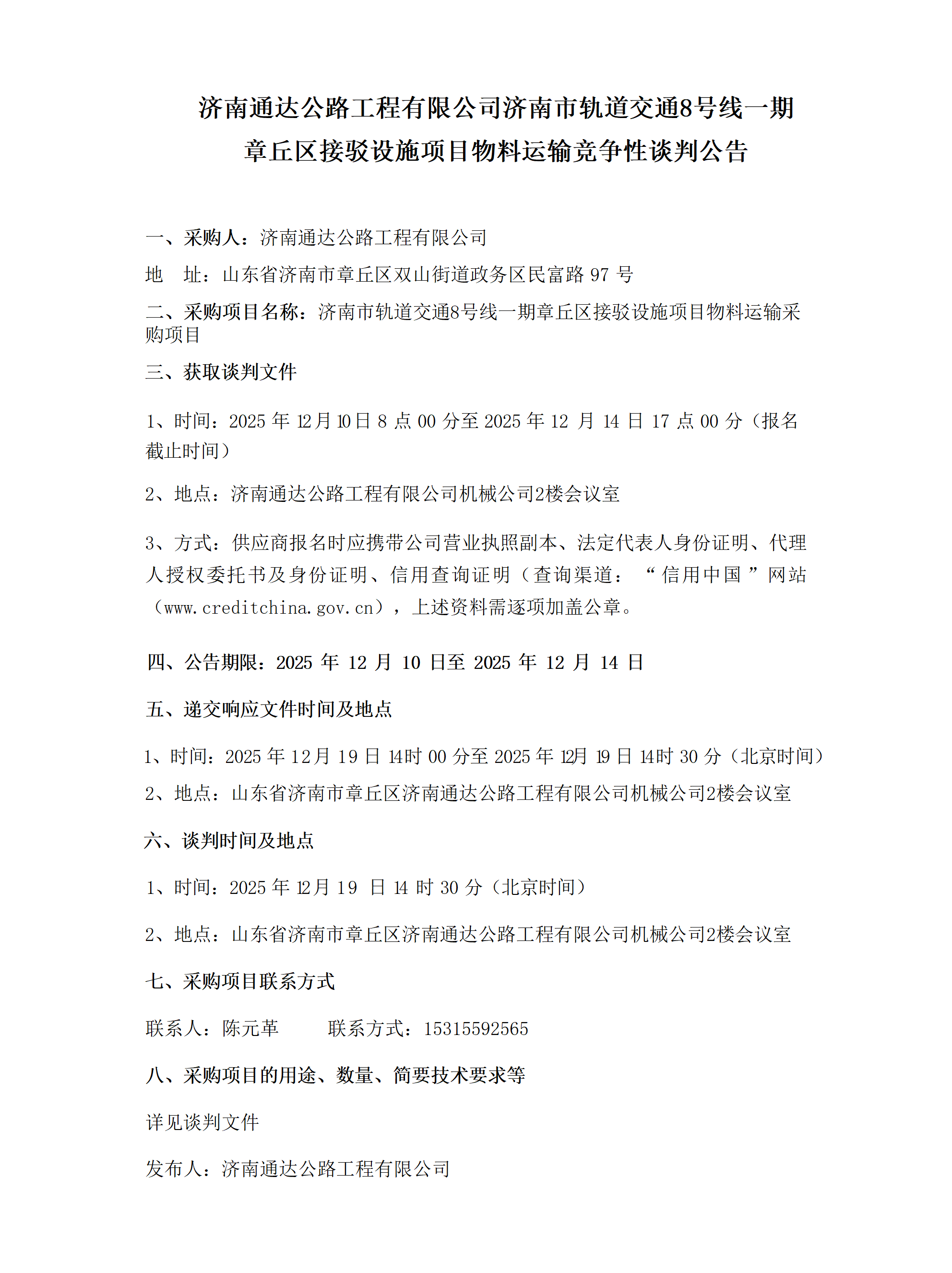 济南通达公路工程有限公司济南市轨道交通8号线一期章丘区接驳设施项目物料运输竞争性谈判公告