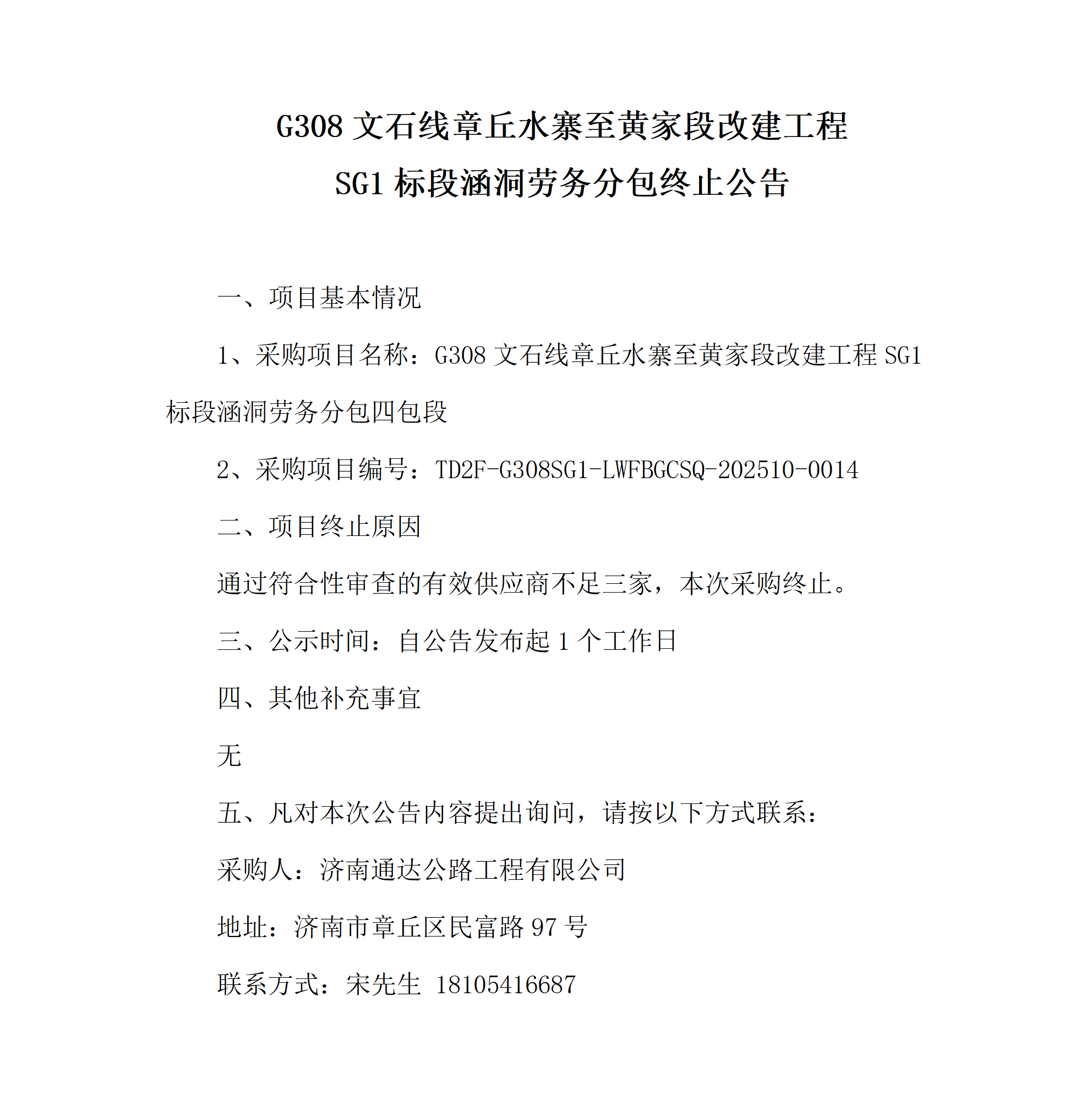 G308文石线章丘水寨至黄家段改建工程SG1标段涵洞劳务分包终止公告