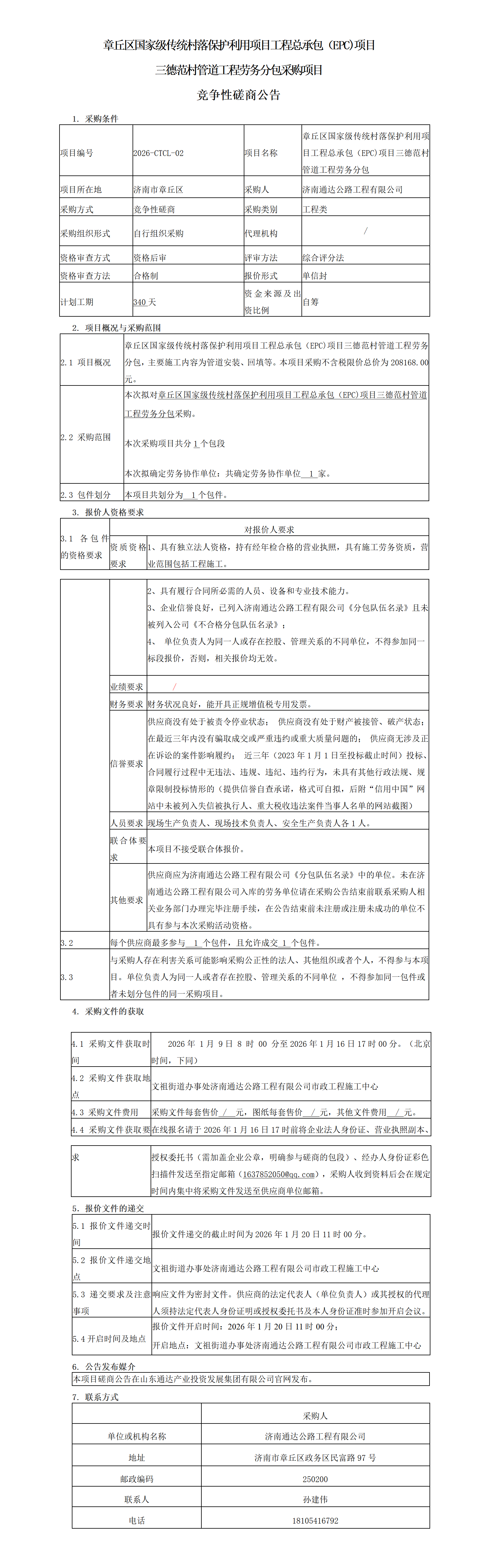 章丘区国家级传统村落保护利用项目工程总承包(EPC)项目三德范村管道工程劳务分包竞争性磋商公告