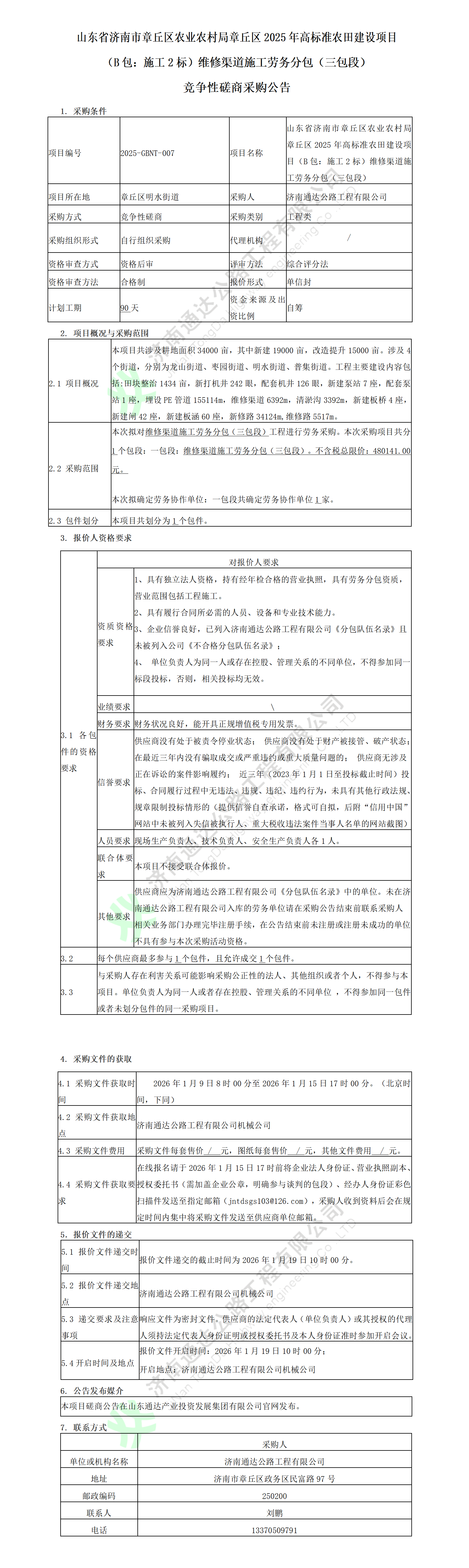 山东省济南市章丘区农业农村局章丘区2025年高标准农田建设项目(B包:施工2标)维修渠道施工劳务分包(三包段)竞争性磋商公告