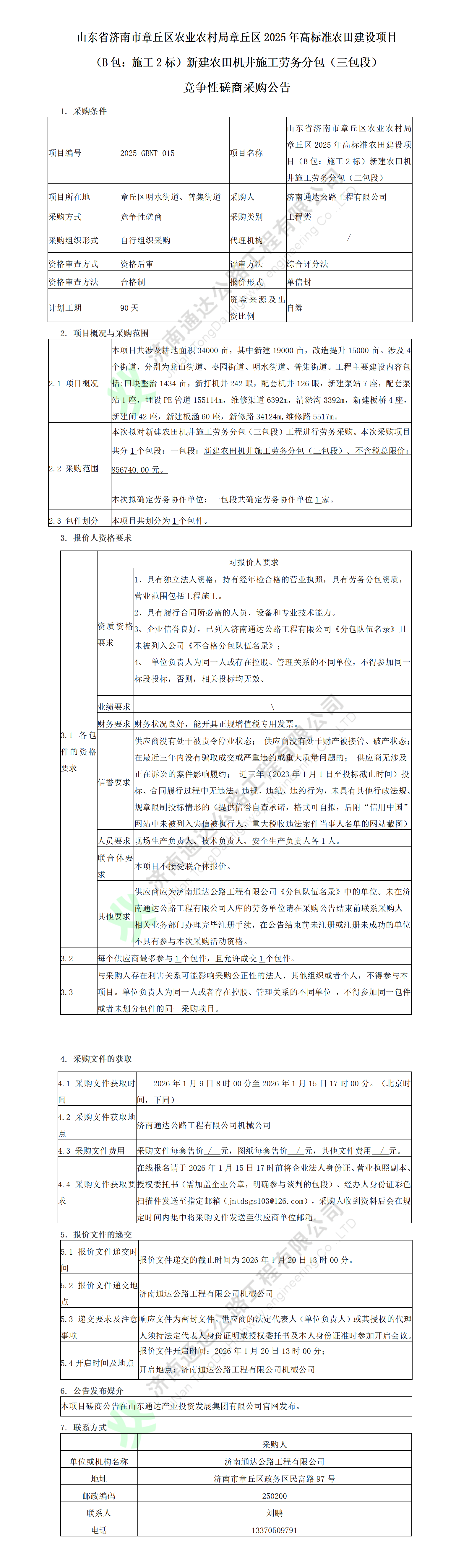 山东省济南市章丘区农业农村局章丘区2025年高标准农田建设项目(B包:施工2标)新建农田机井施工劳务分包(三包段)竞争性磋商公告