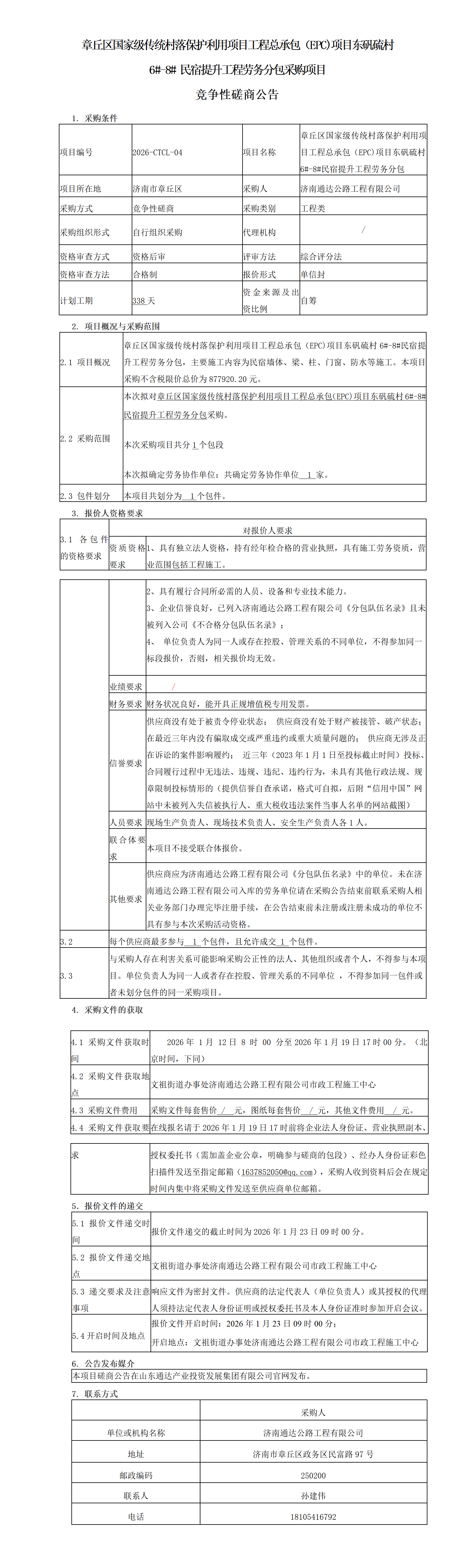章丘区国家级传统村落保护利用项目工程总承包(EPC)项目东矾硫村6#-8#民宿提升工程劳务分包竞争性磋商公告