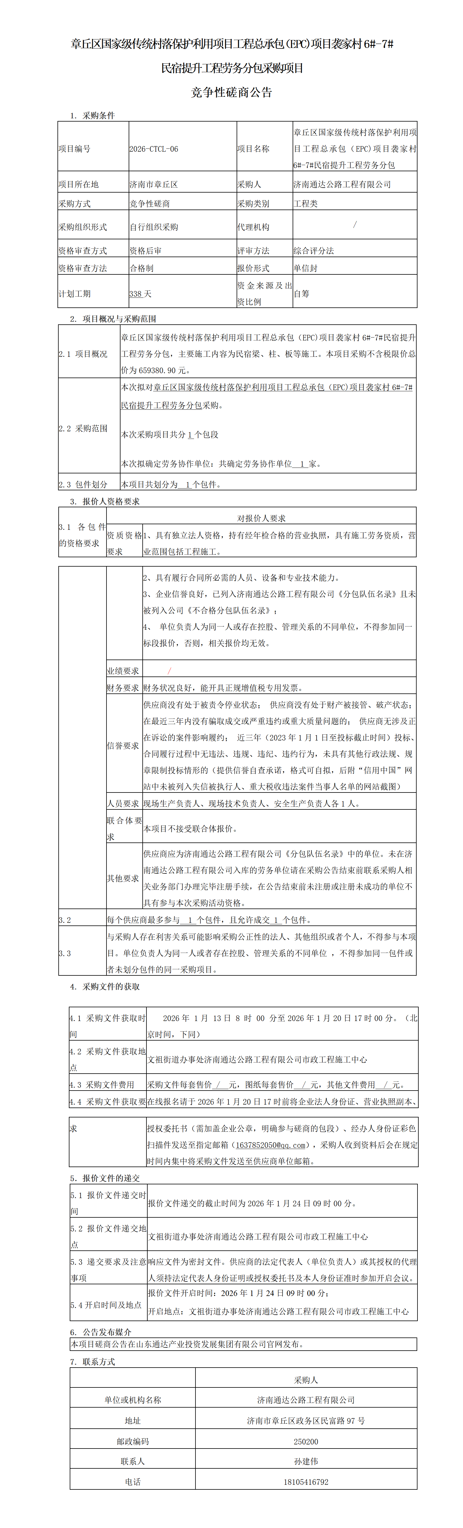 章丘区国家级传统村落保护利用项目工程总承包(EPC)项目袭家村6#-7#民宿提升工程劳务分包采购项目竞争性磋商公告