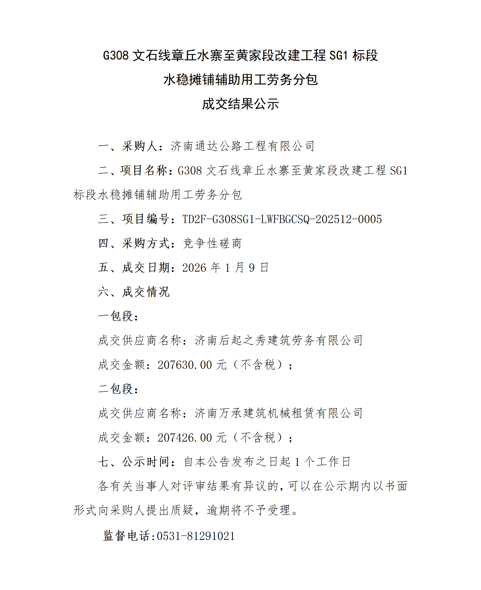 G308文石线章丘水寨至黄家段改建工程SG1标段水稳摊铺辅助用工劳务分包成交结果公示