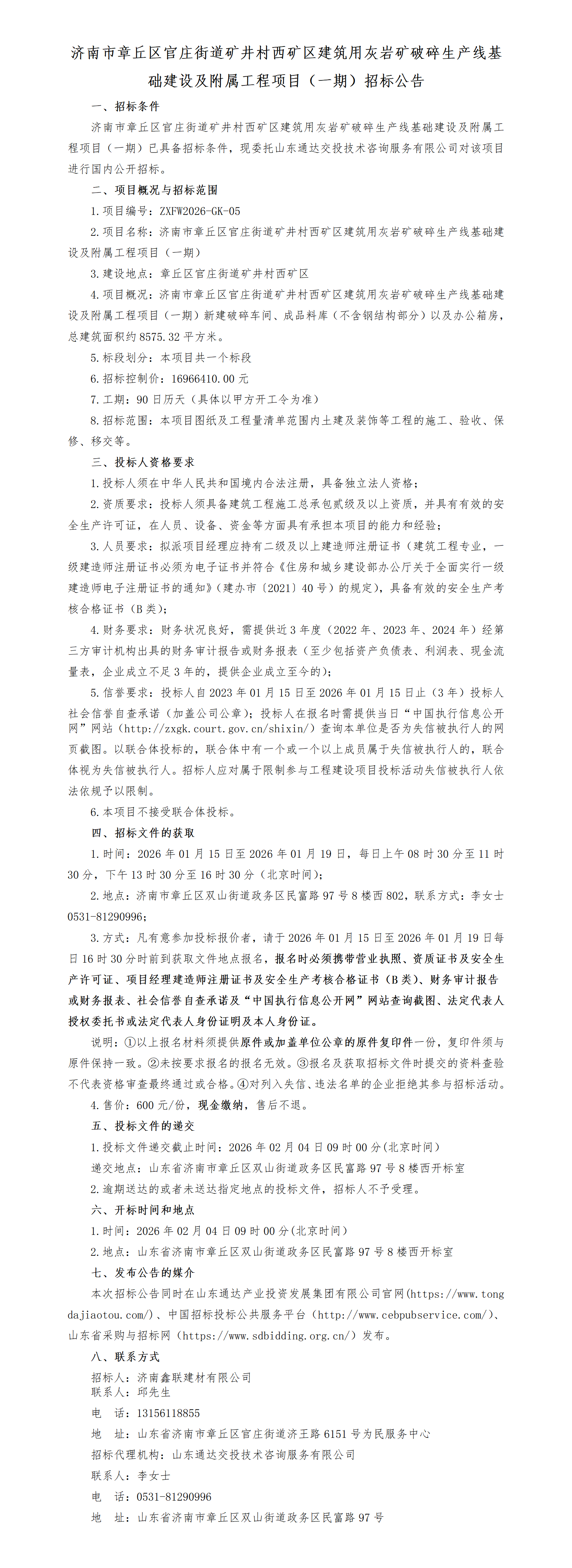 济南市章丘区官庄街道矿井村西矿区建筑用灰岩矿破碎生产线基础建设及附属工程项目(一期)招标公告